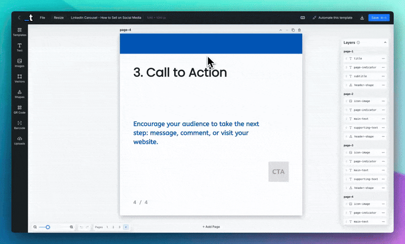Multi-Page Templates - Create Instagram/LinkedIn carousels, slide presentations, and multi-page PDFs directly in the Template Editor. Add, remove, and rearrange pages with ease.